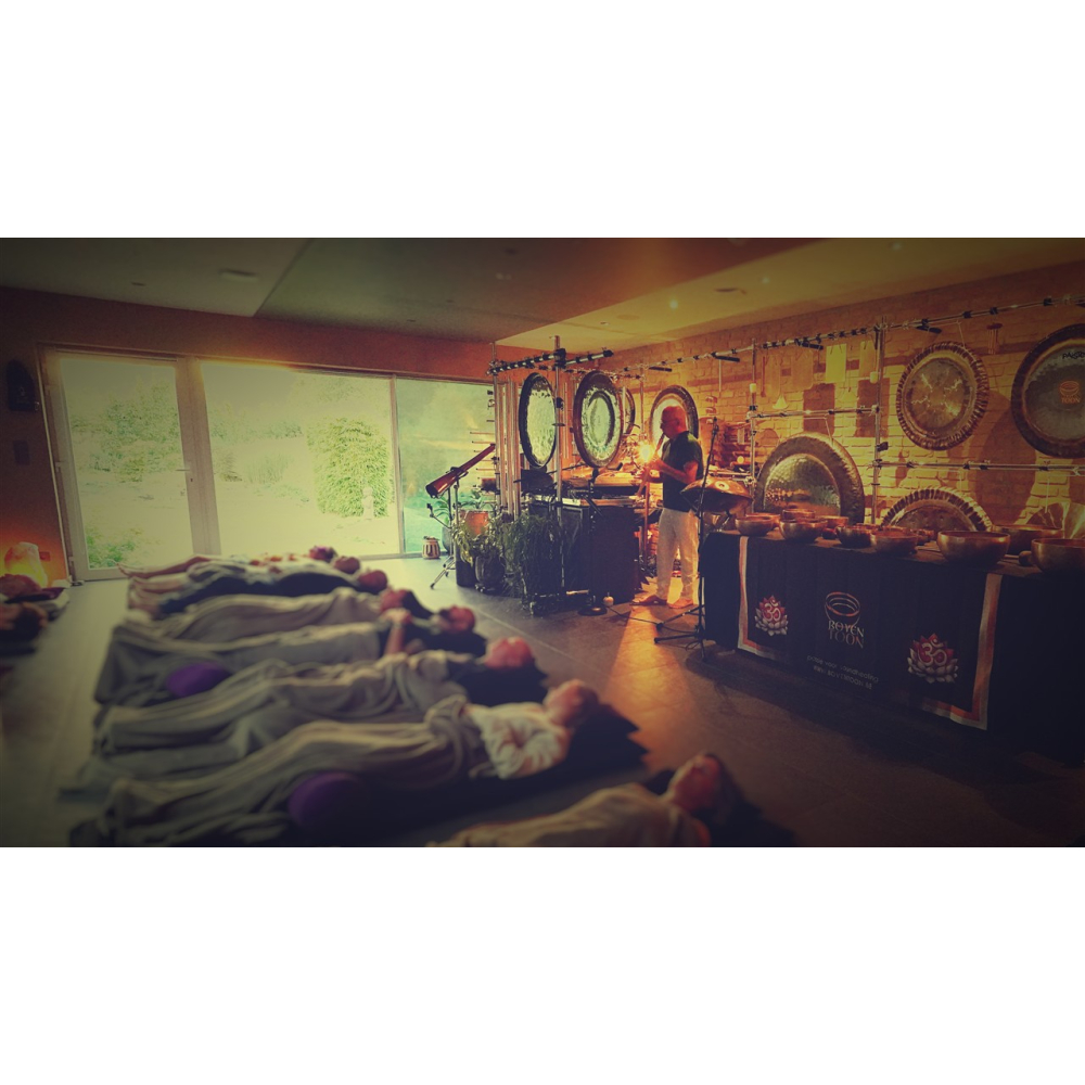 De klankschalen en gongs creëren samen een delicate balans, een ruimte dat intense ontspanning en helderheid toelaat.
